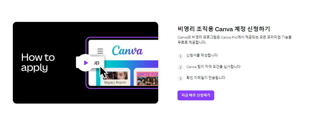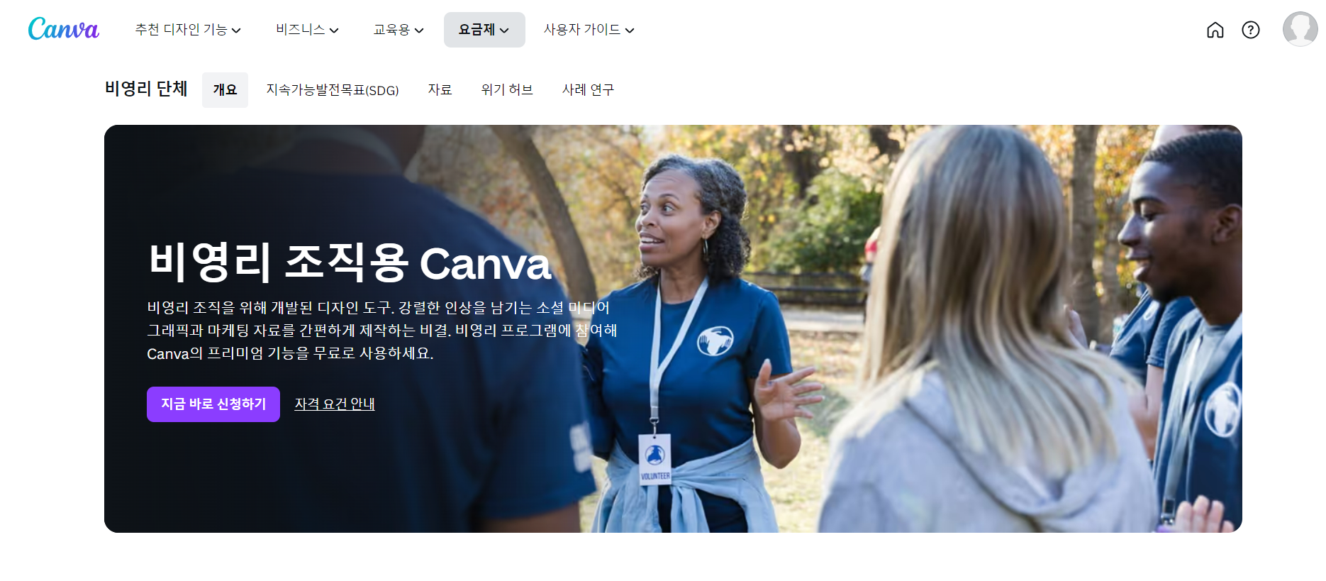 캔바는 개인용 무료 버전과 프로 버전을 제공합니다. 프로 버전은 더 많은 기능과 고급 디자인 요소를 제공하지만 유료 구독이 필요합니다. 하지만 비영리 조직이라면 프로 버전을 무료로 이용할 수 있는 방법이 있습니다.