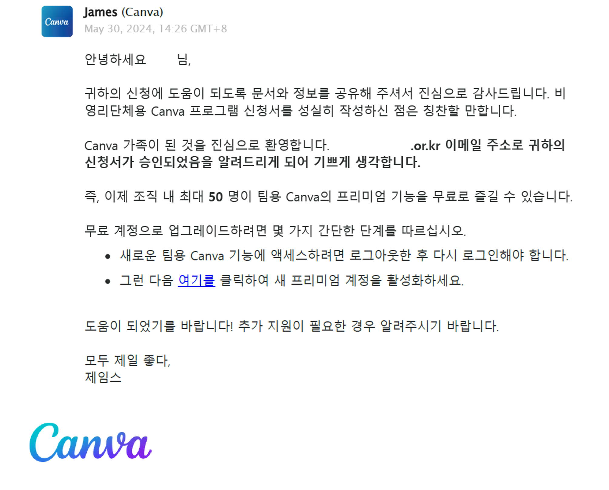 모든 준비가 완료되면 재신청을 제출하고, 캔바의 승인을 기다리세요. 이 과정에서 추가로 필요한 정보나 서류가 있다면, 빠르게 대응하여 제출하시면 됩니다. 저는 다행히 한번에 승인이 되어 현재 소속 직원들과 함께 이용하고 있습니다.